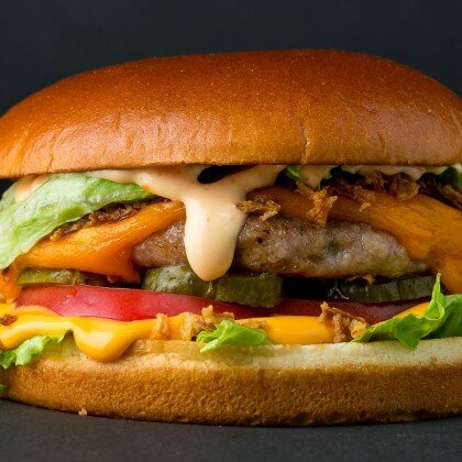 Булочка бриошь, креветки, салат айсберг, помидор, свежий огурец, сыр чеддер, соус сливочная паприка.