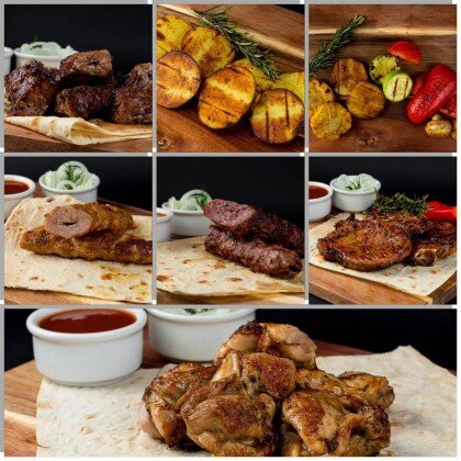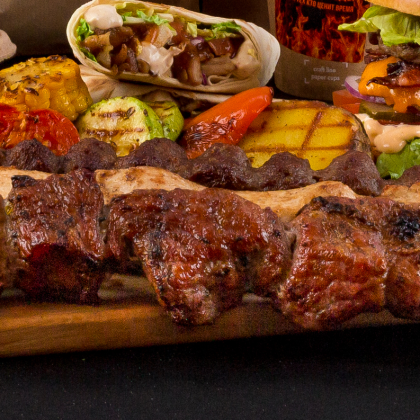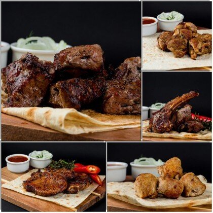 Кебаб из говядины, кебаб из курицы, кебаб из баранины, соус красный, лук маринованный, лаваш.