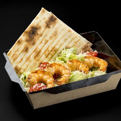 Филе куриной грудки, айсберг, помидор черри, пармезан, соус цезарь, гренки из тандырного лаваша.
