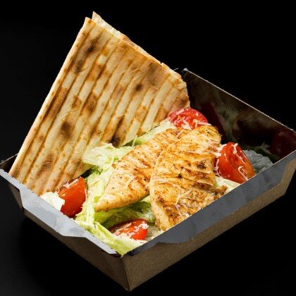 Креветки, айсберг, помидор черри, пармезан, соус цезарь, гренки из тандырного лаваша.