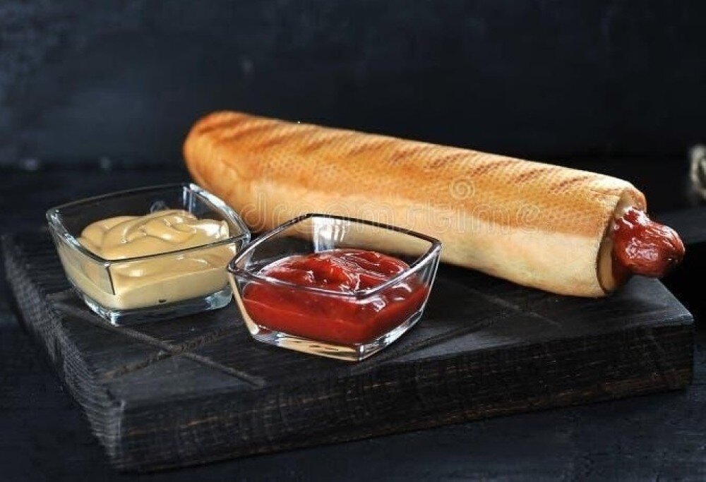Булочка для французского хотдога, говяжья колбаска (халяль), соус гриль, соус горчичный, кетчуп, огурцы маринованные.